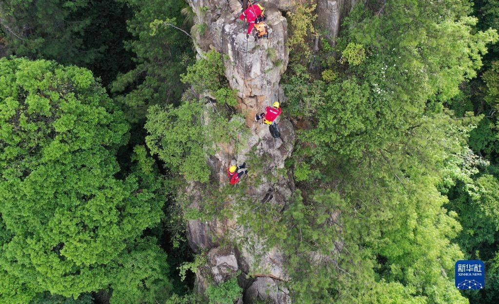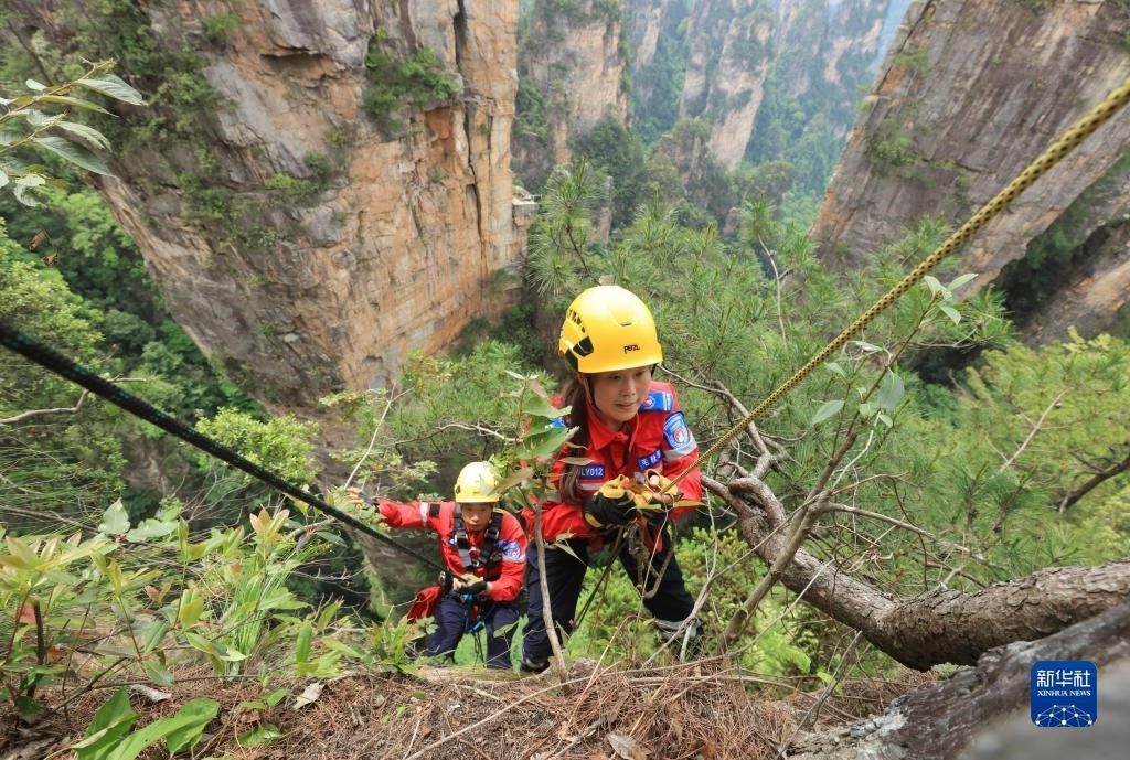5月14日,張家界市武陵源區(qū)山地應(yīng)急救援隊隊員在天子山的絕壁間索降。   新華社發(fā)(吳勇兵攝)