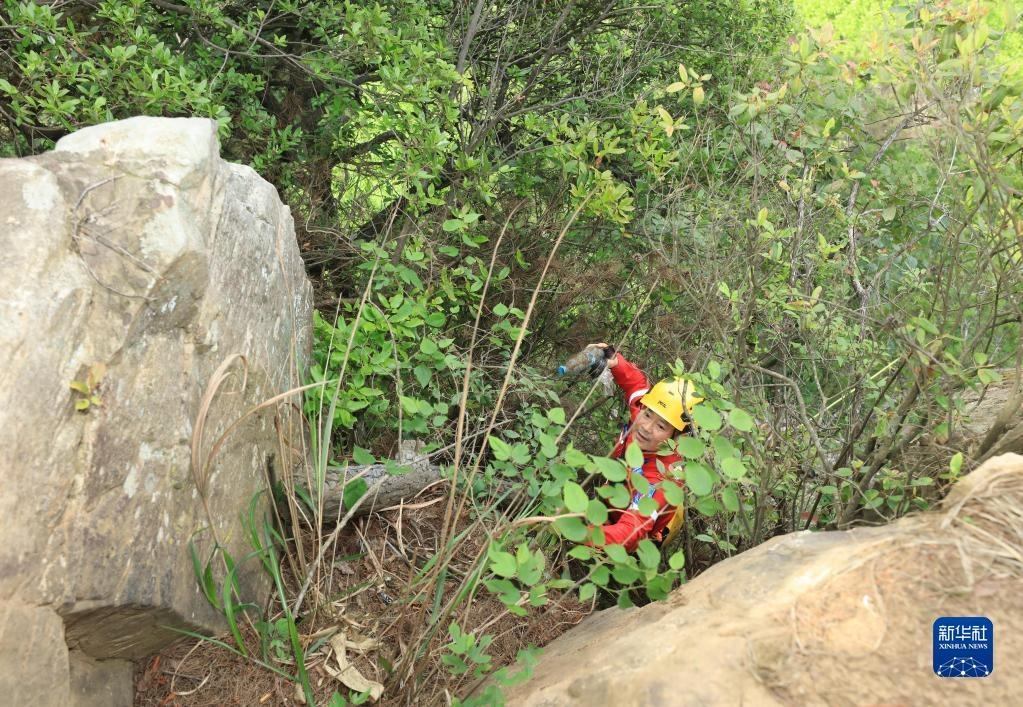5月14日,張家界市武陵源區(qū)山地應(yīng)急救援隊隊員在叢林中撿拾垃圾。   新華社發(fā)(吳勇兵攝)