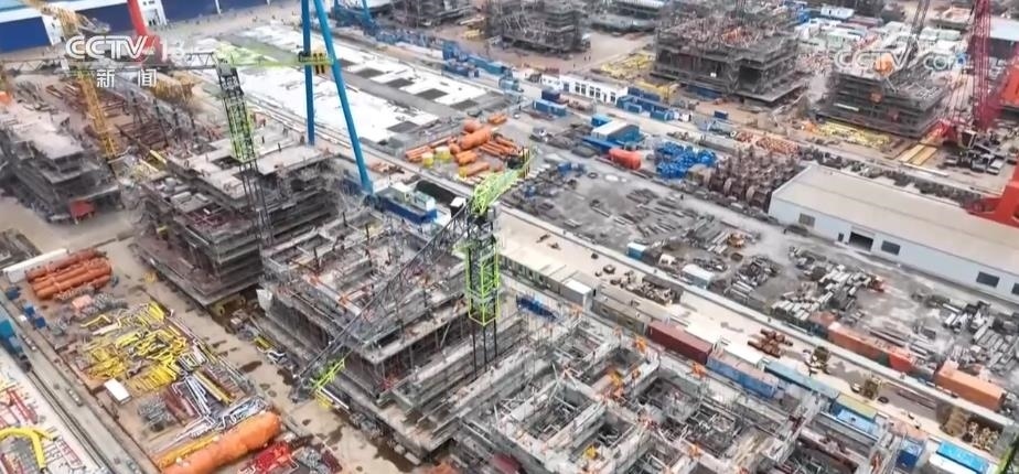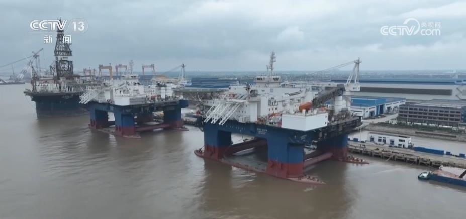 這些大家伙,都是世界技術(shù)比較領(lǐng)先的一些海工裝備。通過航拍的鏡頭,給大家展現(xiàn)一下,最遠(yuǎn)的是圓筒形超深水鉆探平臺。因?yàn)樗耐庑问仟?dú)特的圓筒型設(shè)計,所以它的抗風(fēng)浪性、作業(yè)水深的能力非常得好,技術(shù)指標(biāo)創(chuàng)下多項世界第一。這家企業(yè),一共向國外交付了6艘同類型的產(chǎn)品。