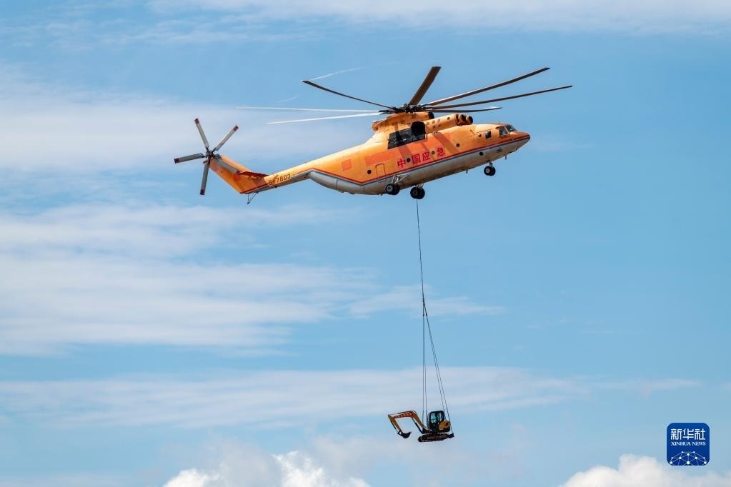 5月16日,一架參演直升機在麗江演習現(xiàn)場上空轉運一臺挖掘機。