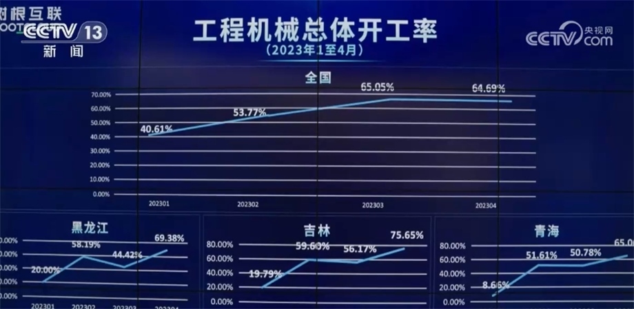 這個(gè)大屏幕反映的是全國挖掘機(jī)的開工情況,相關(guān)負(fù)責(zé)人告訴記者,“挖掘機(jī)指數(shù)”顯示出今年我國工程機(jī)械行業(yè)開始出現(xiàn)回暖跡象。4月份,全國工程機(jī)械總體開工率為64.69%,環(huán)比3月基本持平。12個(gè)省(區(qū)、市)創(chuàng)下今年以來最好成績。