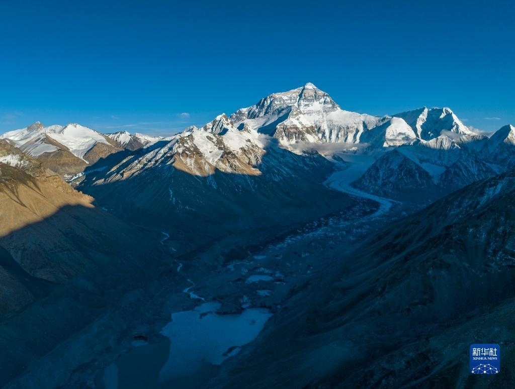 這是日落時分的珠峰和絨布冰川(5月16日攝,無人機照片)。