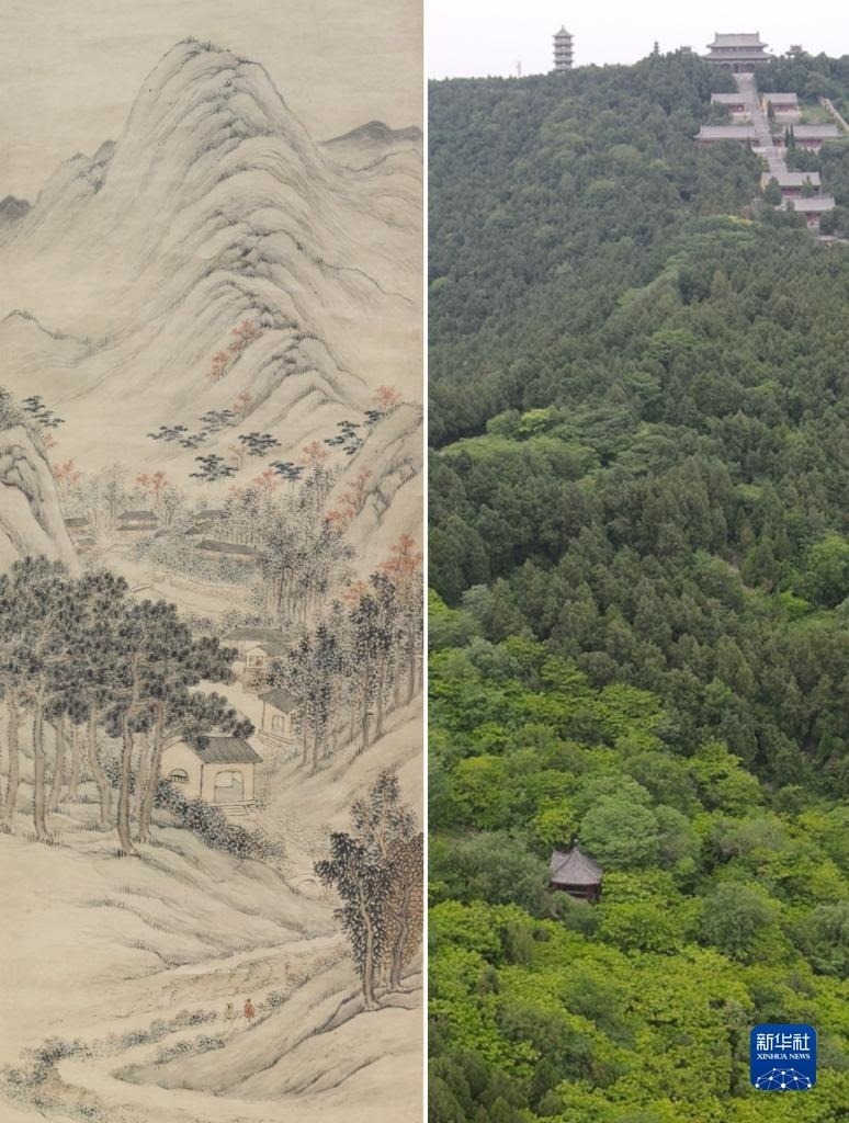 這是一張拼版照片,左圖為:《八公秋霽圖》,由清代畫家潘思牧創(chuàng)作,現(xiàn)收藏于安徽博物院(新華社發(fā),李鵬飛 攝);右圖為:5月16日拍攝的位于安徽省淮南市壽縣的八公山風(fēng)景區(qū)(無人機(jī)照片,新華社記者張端攝)。