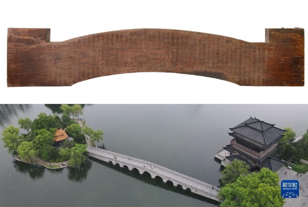 這是一張拼版照片,上圖為:《逍遙津木刻枋》,現(xiàn)收藏于安徽博物院(新華社發(fā),吳艷攝);下圖為:5月17日拍攝的位于安徽省合肥市的逍遙津公園(無人機(jī)照片,新華社記者張端攝)。