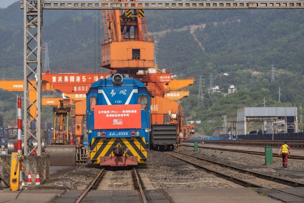 4月27日,太平船務(wù)——西部陸海新通道江鐵海聯(lián)運(yùn)非洲專列在重慶果園港魚(yú)嘴站等待發(fā)車(chē)。新華社記者 黃偉 攝