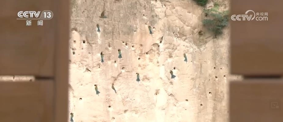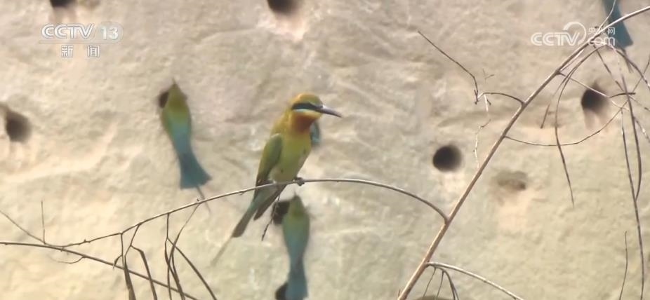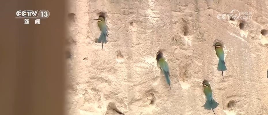 眼前,這些看上去很像是泥巴墻的建筑,其實是人工建造的候鳥巢穴。根據(jù)栗喉蜂虎的生活習慣,保護區(qū)工作人員專門在它們回來之前就對懸壁進行修整,讓這些美麗的小鳥更方便安家。
