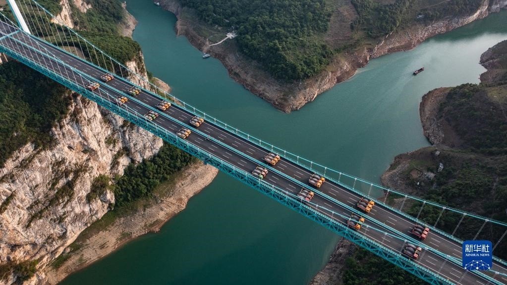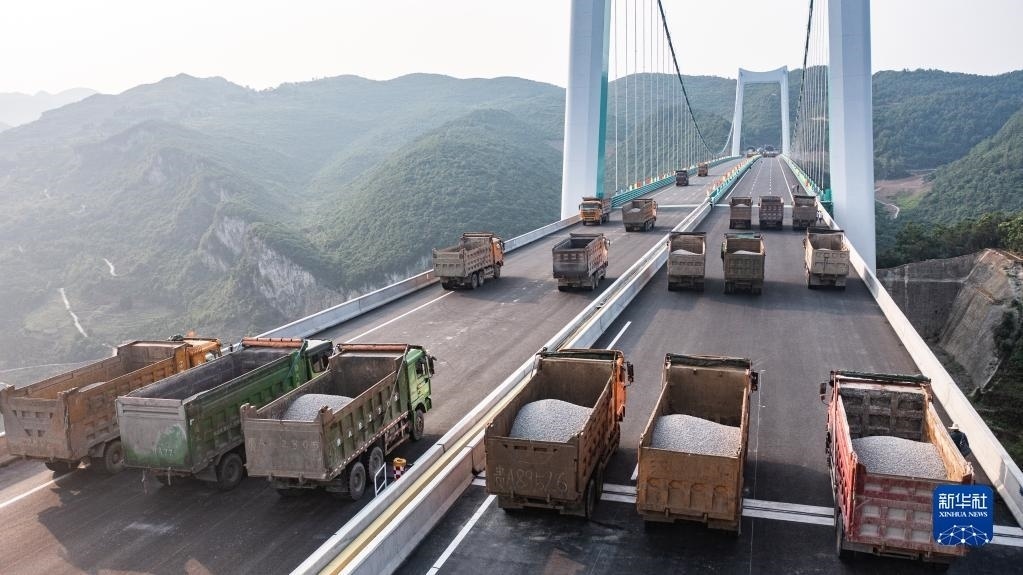當日,由貴州路橋集團承建的金烽烏江大橋進行靜態(tài)荷載試驗,48輛負載砂石的大型貨車有序行駛到固定的位置進行對稱、偏心檢測,檢驗橋梁結(jié)構(gòu)整體的施工質(zhì)量與受力性能,為橋梁竣工驗收提供科學(xué)依據(jù)。