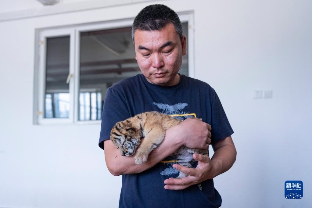 5月22日,在黑龍江東北虎林園的虎舍中,飼養(yǎng)員查看東北虎幼崽生長狀況。