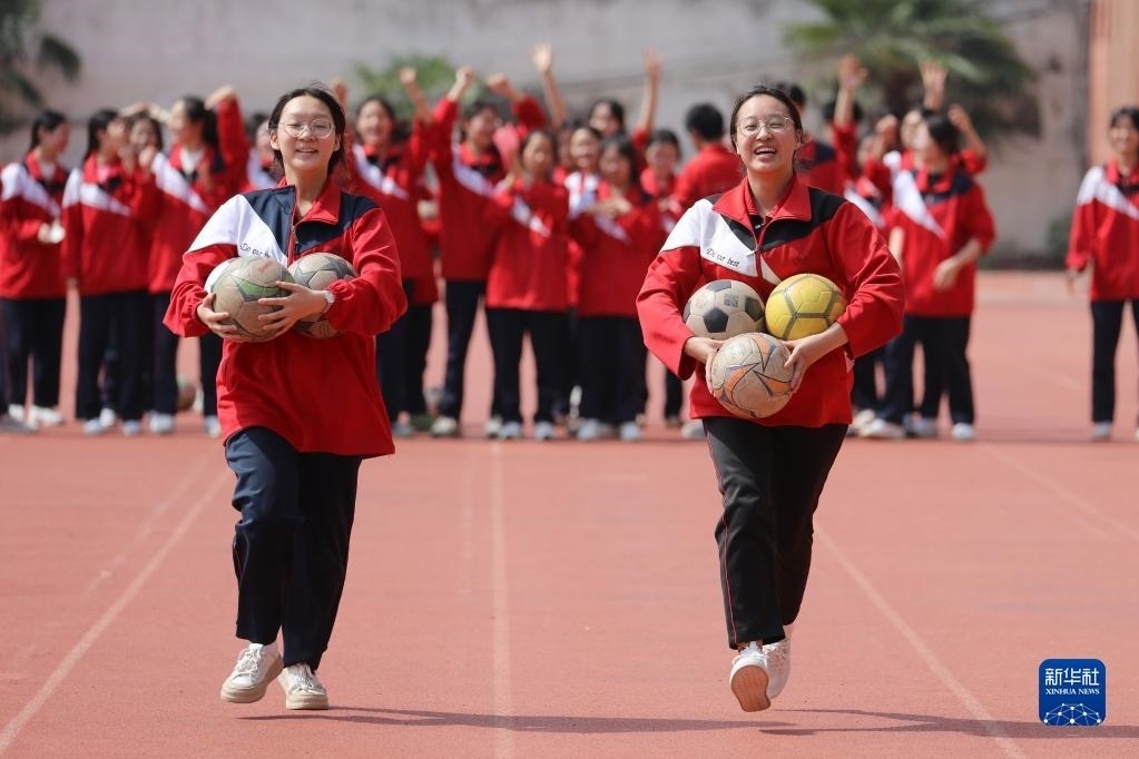 5月24日,在貴州省黔東南苗族侗族自治州岑鞏縣第一中學,高三學生在足球場上做游戲減壓。