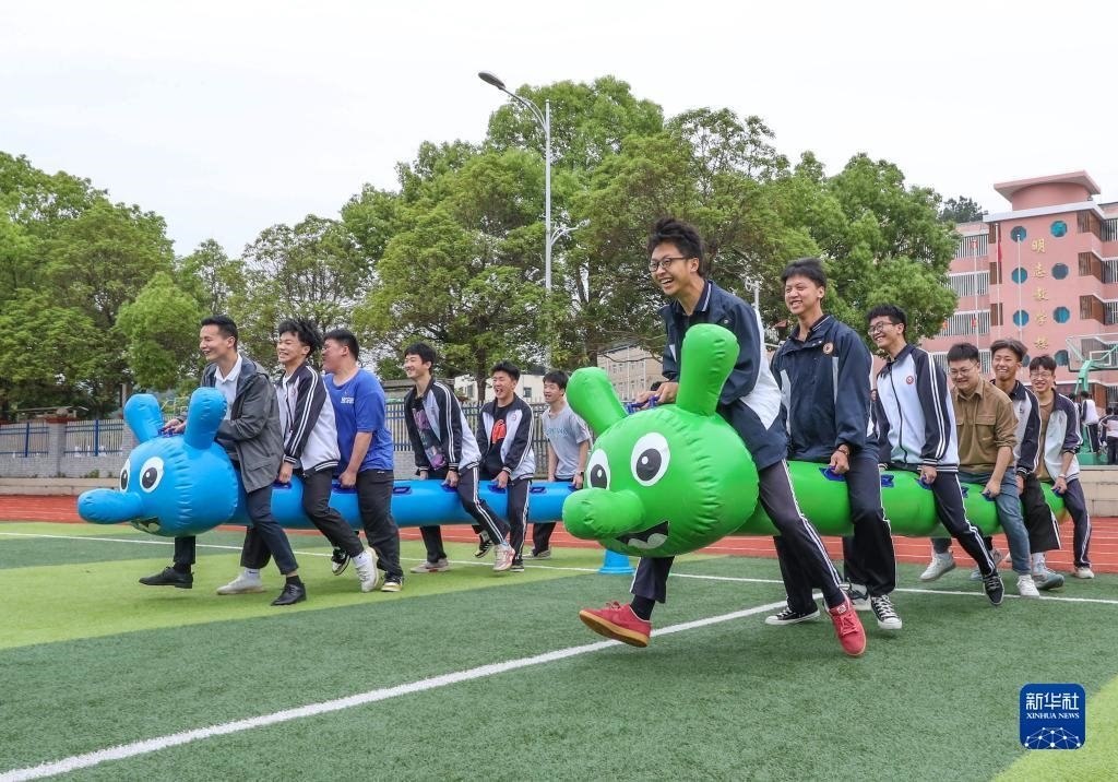 5月23日,河南省焦作市溫縣實驗高中高三學生在操場上做游戲減壓。