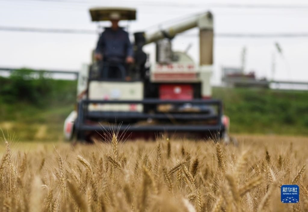 5月23日,河南省駐馬店市正陽(yáng)縣大林鎮(zhèn)漫塘村的村民駕駛農(nóng)機(jī)收獲小麥。