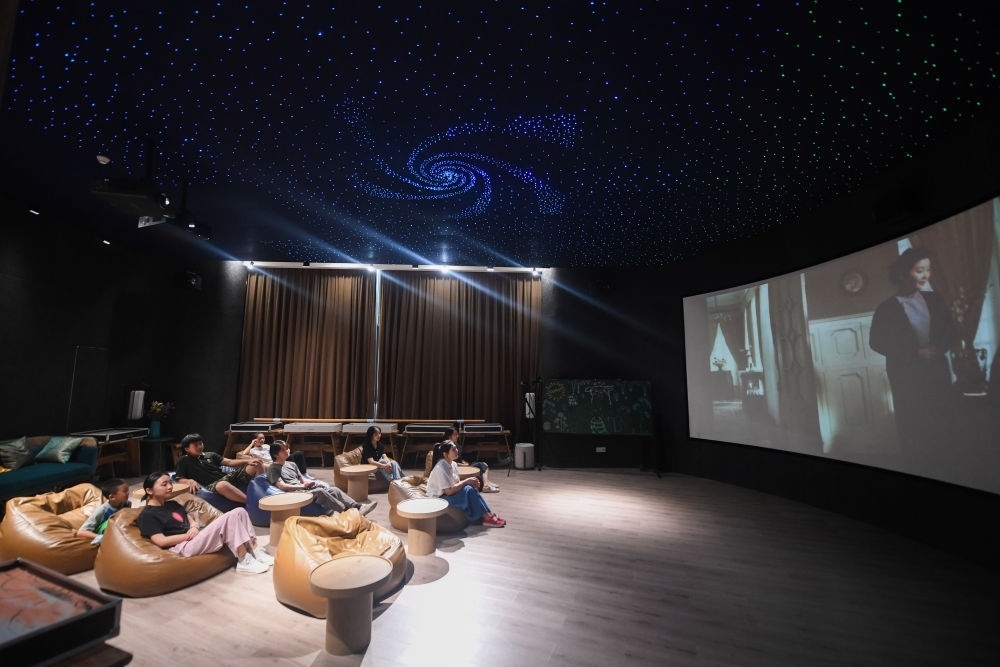 居民在位于浙江省杭州市富陽(yáng)區(qū)銀湖街道硅谷社區(qū)的“合之舍”書(shū)房的影視廳觀看電影,該書(shū)房是銀湖街道“15分鐘品質(zhì)文化生活圈”的示范點(diǎn)位(2022年7月2日攝)。新華社記者 徐昱 攝