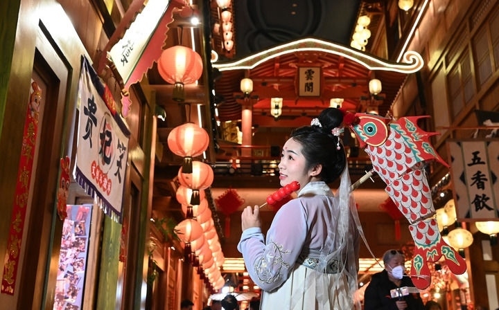 身穿傳統(tǒng)服飾的游客在陜西省西安市“長(zhǎng)安十二時(shí)辰”主題街區(qū)游玩(2023年1月24日攝)。新華社記者 劉瀟 攝