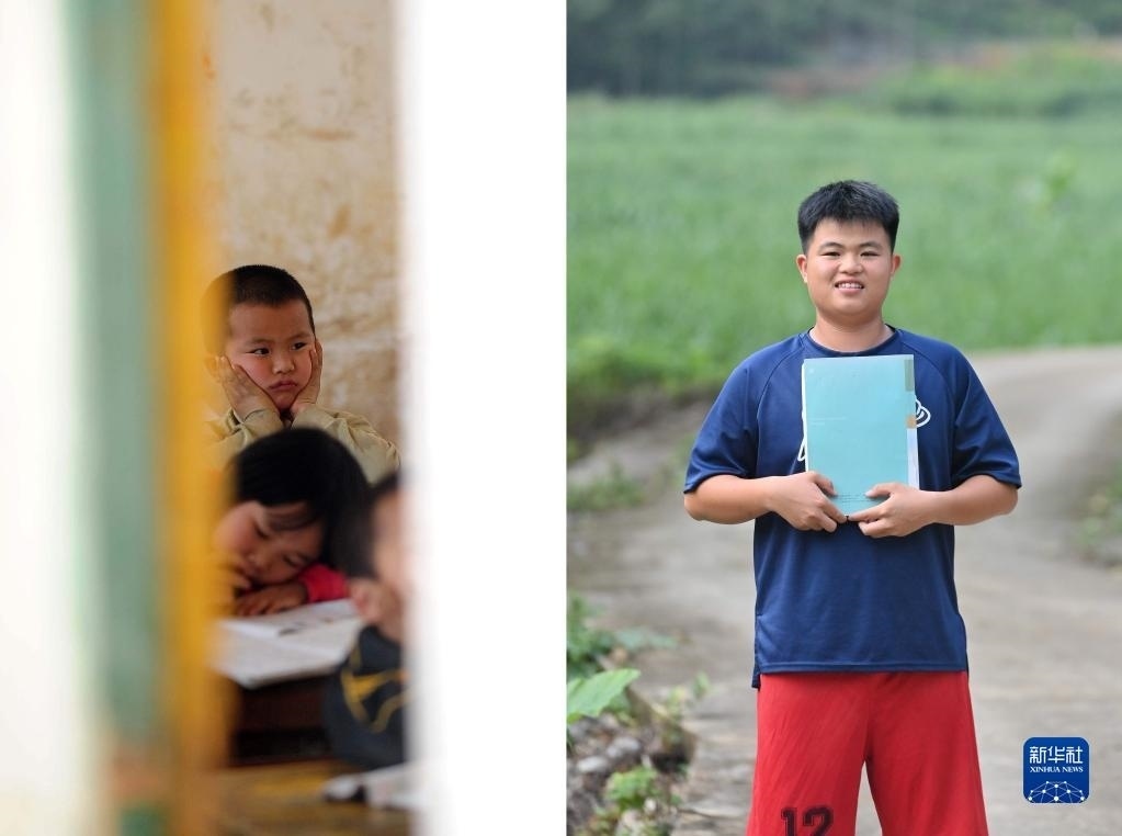 拼版照片:左圖為2012年7月4日,在大化瑤族自治縣板升鄉(xiāng)弄勇小學,7歲的蒙錦晨在課堂上;右圖為2023年1月25日,在大化瑤族自治縣板升鄉(xiāng)弄勇村,正在浙江省臺州職業(yè)技術學院讀大一的蒙錦晨寒假回家時在村中留影。 新華社記者 黃孝邦 攝
