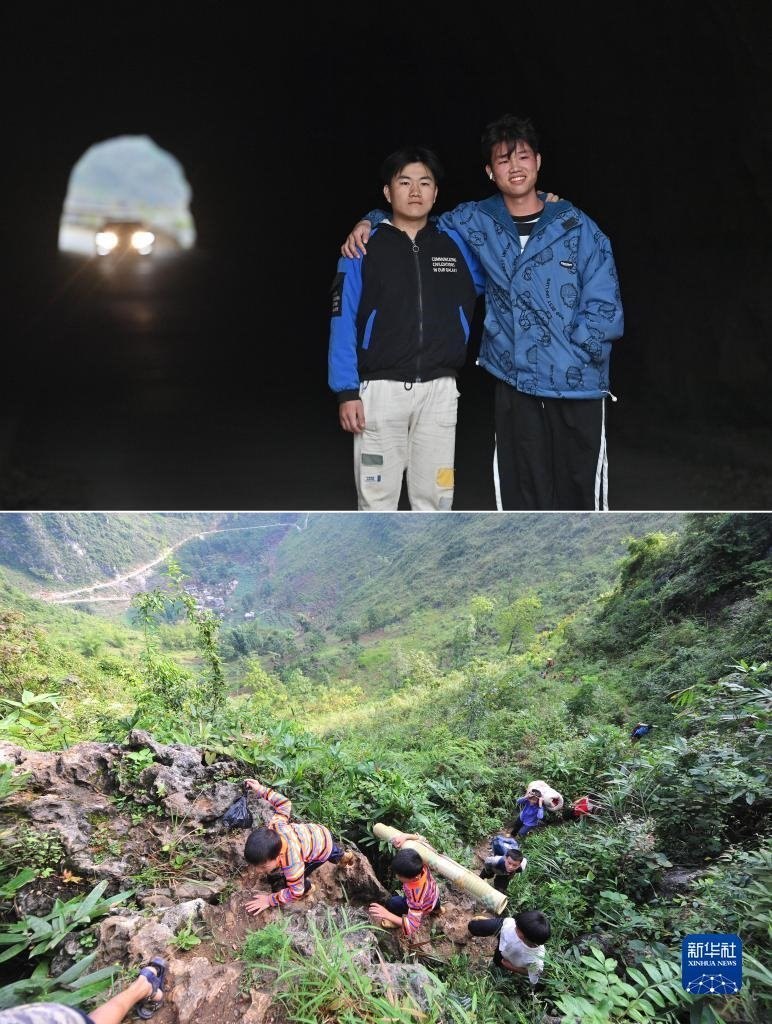 拼版照片:上圖為2023年1月20日,在大化瑤族自治縣板升鄉(xiāng)弄勇村,22歲的蒙宣任(左)和弟弟蒙宣汰站在通往弄勇小學的隧道旁合影,隧道上方是他們兒時上學需要攀爬的“天梯”;下圖為2012年9月3日,在大化瑤族自治縣板升鄉(xiāng)弄勇村,蒙宣汰(左一)、蒙宣任(左二)爬山路去學校。蒙宣任目前在遼寧省交通高等專科學校讀書,弟弟蒙宣汰從技校畢業(yè)后在廣東一家汽修廠上班。