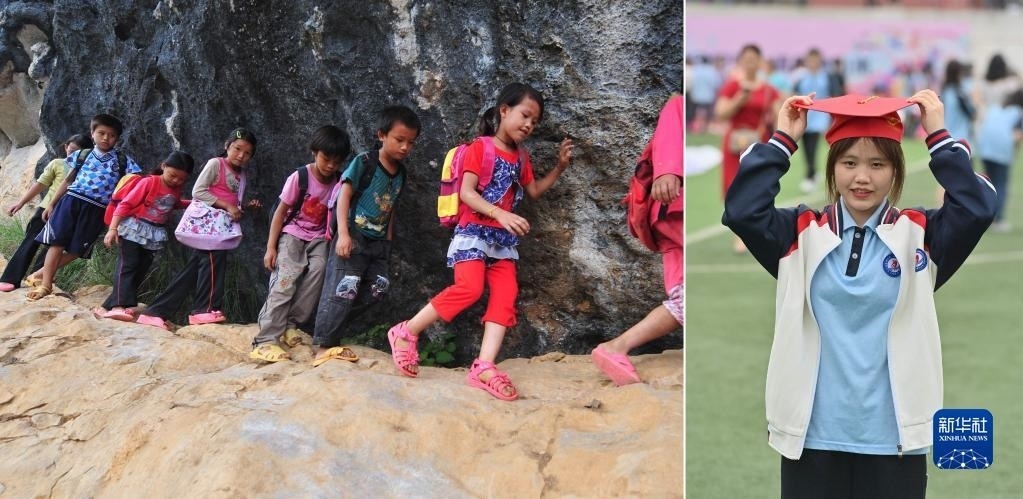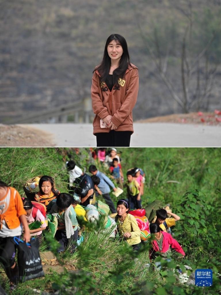 拼版照片:上圖為2023年5月27日,22歲的蒙秋艷站在她就讀的廣西醫(yī)科大學校門口(新華社發(fā));下圖為2012年9月3日,在大化瑤族自治縣板升鄉(xiāng)弄雷村哈保屯,11歲的蒙秋艷(右一)在懸崖邊護著低年級的小伙伴回家(新華社記者黃孝邦攝)。2021年,蒙秋艷以優(yōu)異的成績,考取廣西醫(yī)科大學。