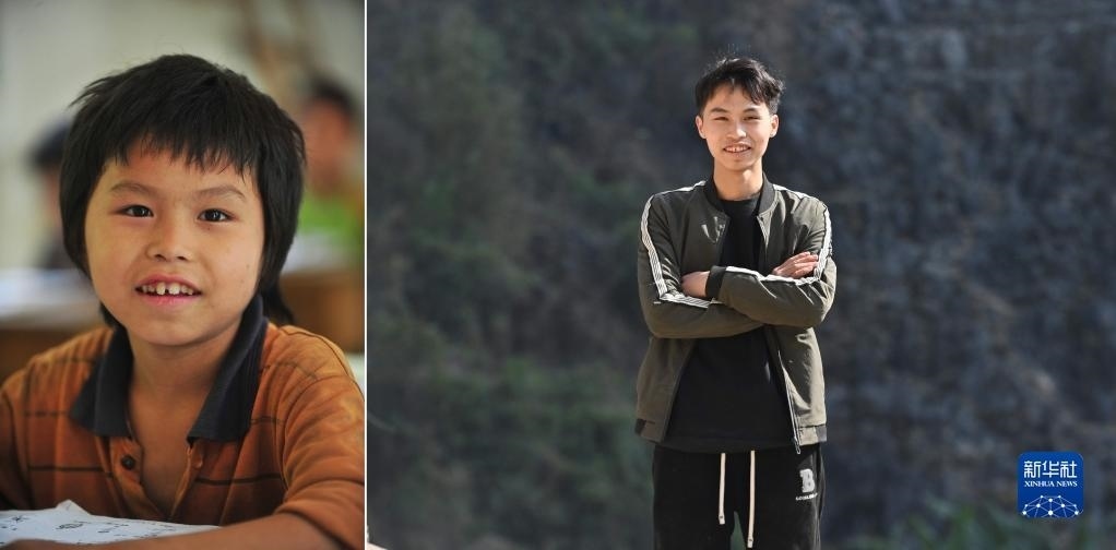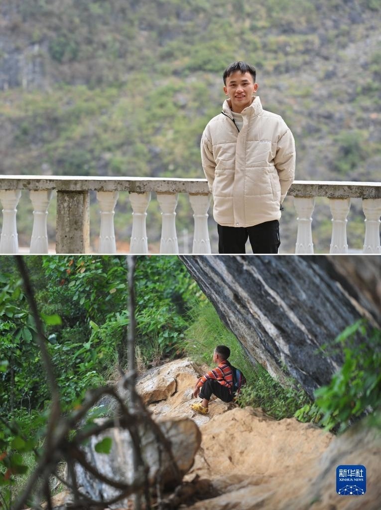 拼版照片:上圖為2023年1月16日,在大化瑤族自治縣板升鄉(xiāng)弄雷村,即將從技校畢業(yè)的蒙科佑站在家門口;下圖為2012年9月5日,在大化瑤族自治縣板升鄉(xiāng)弄雷村,10歲的蒙科佑在上學途中,坐在懸崖邊上休息。21歲的蒙科佑,希望能掙錢供弟弟妹妹讀書,讓他們接受更好的教育。