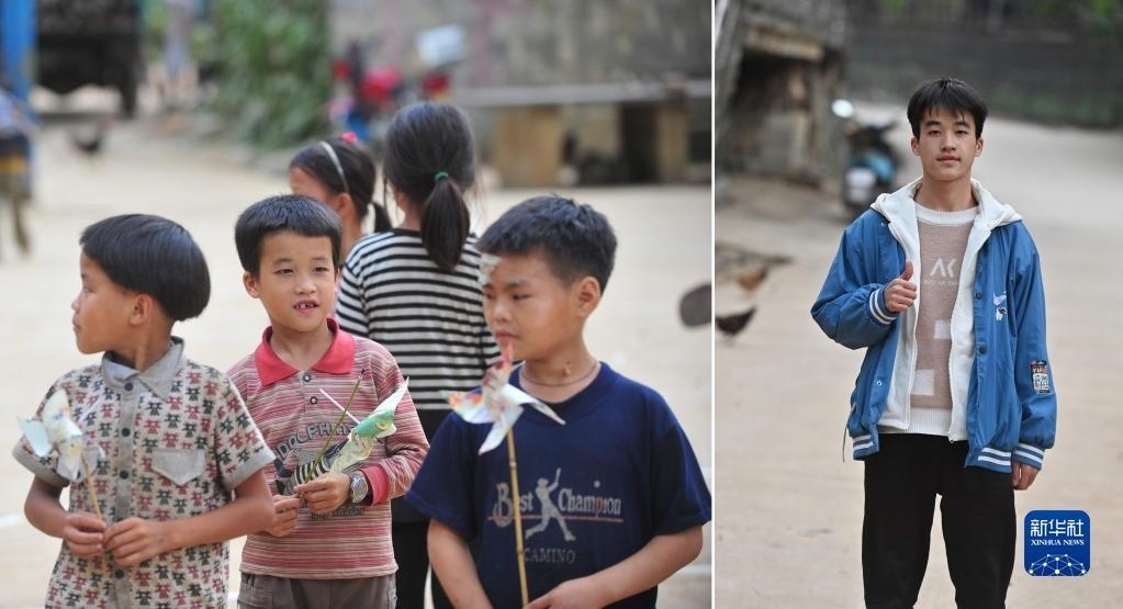 拼版照片:左圖為2012年7月4日,在大化瑤族自治縣板升鄉(xiāng)弄勇小學,7歲的蒙旺兵(左二)在校園里玩風車;右圖為2023年1月25日,在大化瑤族自治縣板升鄉(xiāng)弄勇村,正在桂林理工大學讀大一的蒙旺兵寒假回家時在村中留影。 新華社記者 黃孝邦 攝
