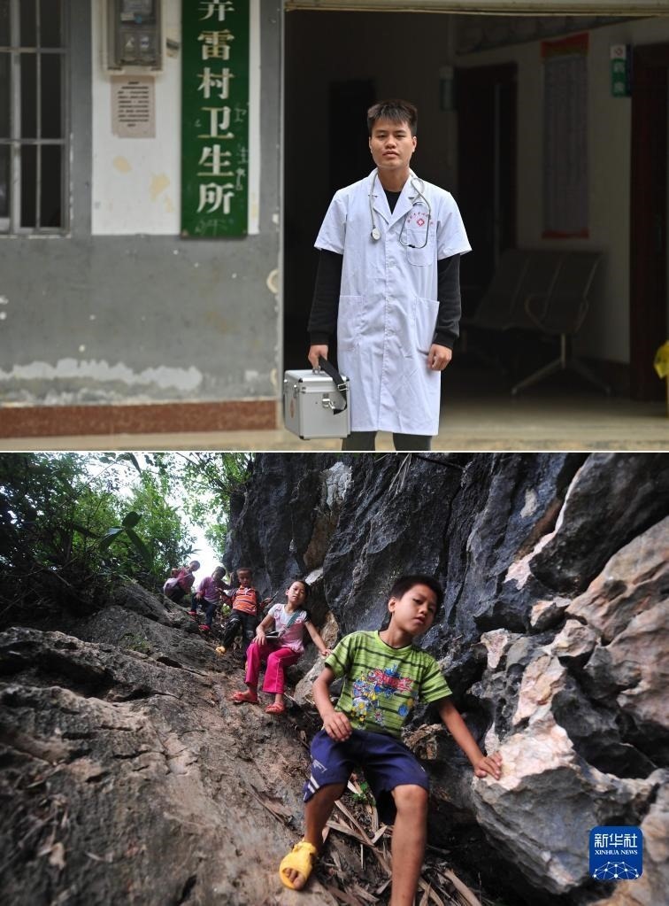 拼版照片:上圖為2023年5月24日,村醫(yī)蒙富松站在大化瑤族自治縣板升鄉(xiāng)弄雷村衛(wèi)生所前(新華社記者胡星宇攝);下圖為2012年9月5日,10歲的蒙富松(右一)爬懸崖去學校讀書(新華社記者黃孝邦攝)。2021年,蒙富松從衛(wèi)校畢業(yè),回到家鄉(xiāng)成為一名村醫(yī)。 新華社發(fā)