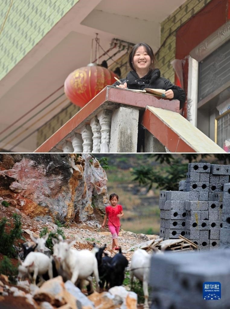 拼版照片:上圖為2023年1月16日,在大化瑤族自治縣板升鄉(xiāng)弄勇村,正在讀初中的藍秀雪在家門口學習;下圖為2013年7月14日,5歲的藍秀雪在放羊。16歲的藍秀雪即將參加中考,希望能考上一所好高中。