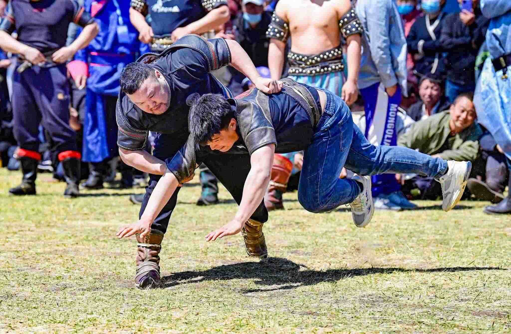 2023年5月26日,內(nèi)蒙古興安盟,科爾沁右翼前旗德伯斯鎮(zhèn)阿日林一合嘎查舉行首屆那達(dá)慕,設(shè)置的賽馬、布魯、搏克、拔河等傳統(tǒng)體育娛樂(lè)項(xiàng)目,吸引嘎查周邊500余名牧民參加比賽,喜慶牧業(yè)豐收季。視覺(jué)中國(guó)