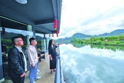 在浙江杭州臨安區(qū)昌化鎮(zhèn)白牛村,村落景區(qū)投資運(yùn)營(yíng)商羅星玥(右一)向游客介紹白牛村的自然風(fēng)光。新華社發(fā)