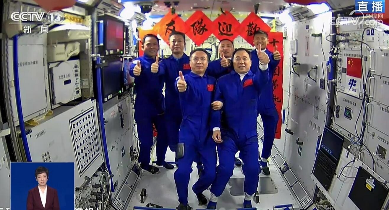 央視網(wǎng)消息:宇宙星河浪漫,探索永不止步。今天(5月30日)9時(shí)31分,搭載神舟十六號(hào)載人飛船的長征二號(hào)F遙十六運(yùn)載火箭在酒泉衛(wèi)星發(fā)射中心點(diǎn)火發(fā)射,發(fā)射任務(wù)取得圓滿成功。神舟十六號(hào)航天員景海鵬、朱楊柱、桂海潮順利進(jìn)入太空。神舟十六號(hào)載人飛船入軌后,在16時(shí)29分成功對接于空間站天和核心艙徑向端口。之后,神舟十六號(hào)航天員乘組從飛船返回艙進(jìn)入軌道艙。翹盼已久的神舟十五號(hào)航天員乘組打開“家門”,歡迎遠(yuǎn)道而來的神舟十六號(hào)航天員乘組入駐“天宮”。