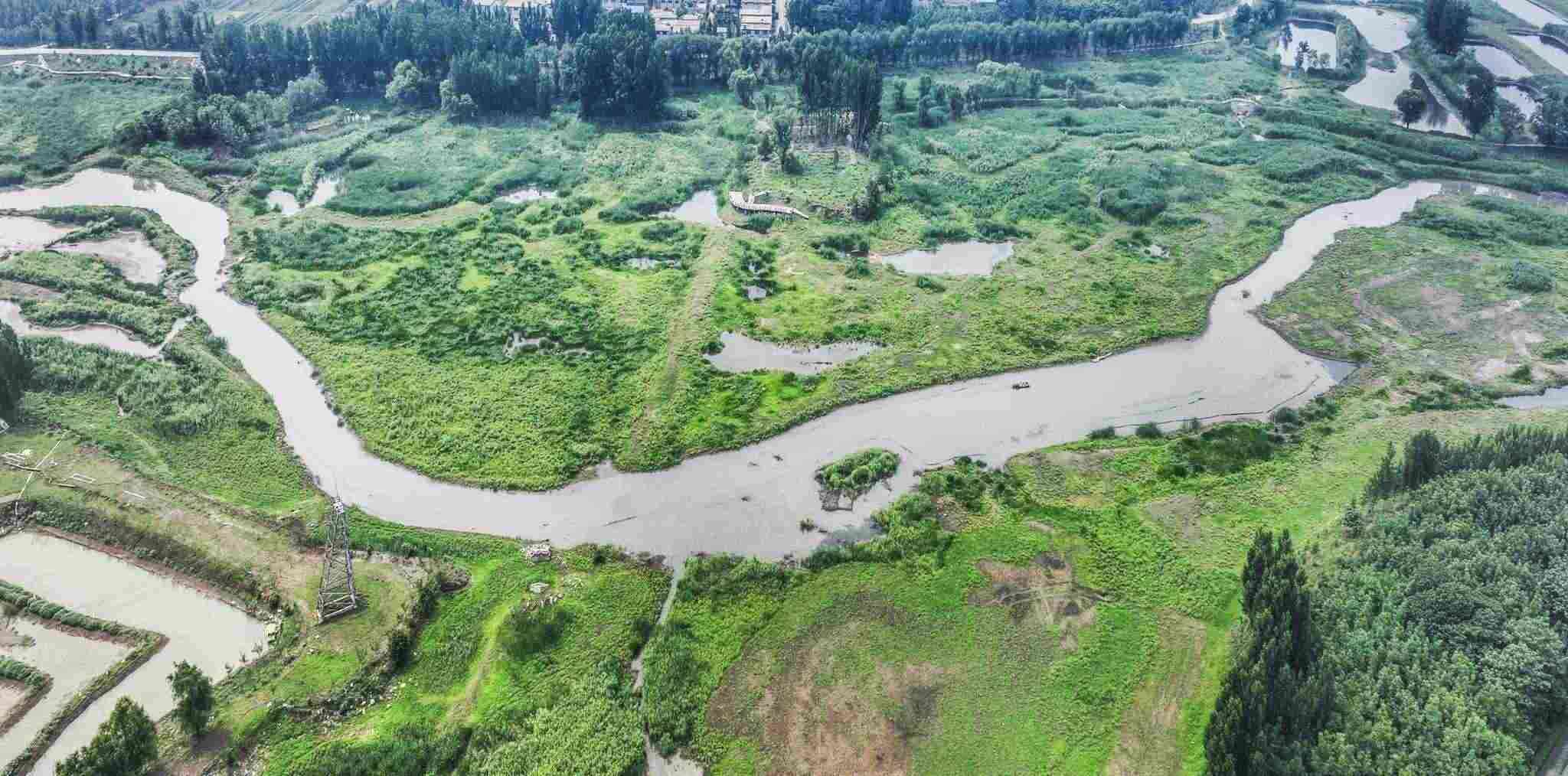 2023年5月31日,山東棗莊,薛城區(qū)蟠龍河國家濕地公園綠意盎然、流水潺潺、水鳥翩躚而至,繪就一幅美麗的生態(tài)畫卷。視覺中國