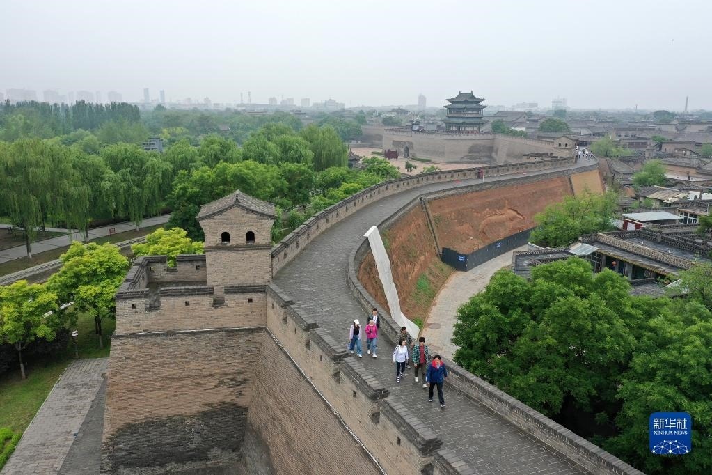 游客在平遙古城城墻上游覽(5月30日攝,無人機照片)。
