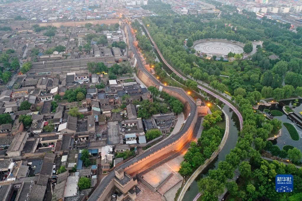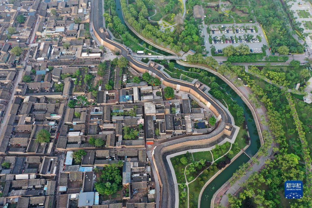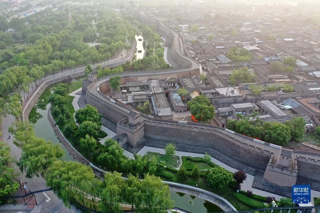 平遙古城一角(5月30日攝,無人機照片)。
