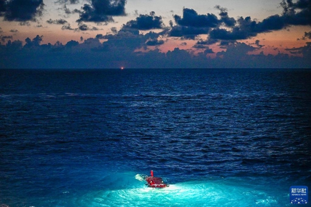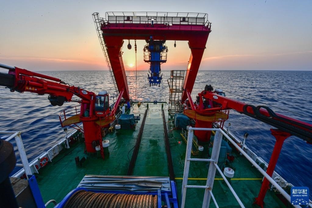 搭載著考古隊(duì)員的“深海勇士”號載人潛水器從“探索一號”科考船下放至海面,即將下潛開始當(dāng)日的水下調(diào)查(5月24日攝)。