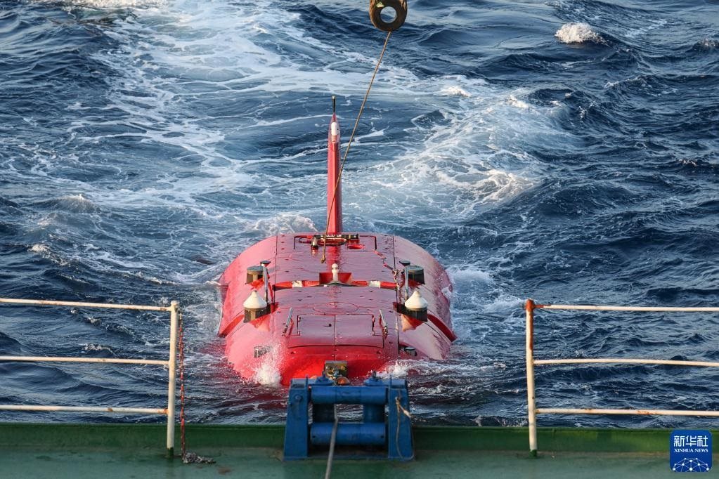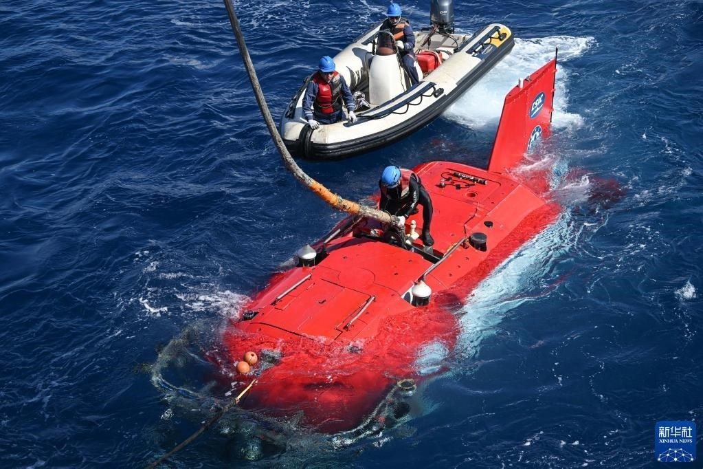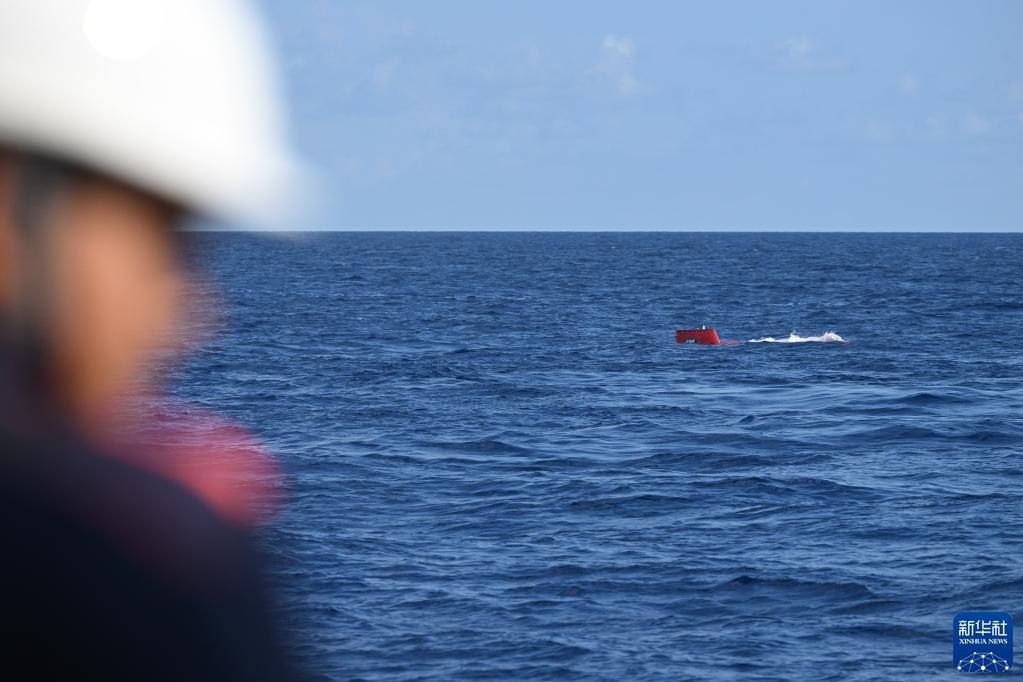 在結(jié)束當(dāng)日的水下調(diào)查后,搭載著考古隊(duì)員的“深海勇士”號載人潛水器浮出海面(5月27日攝)。