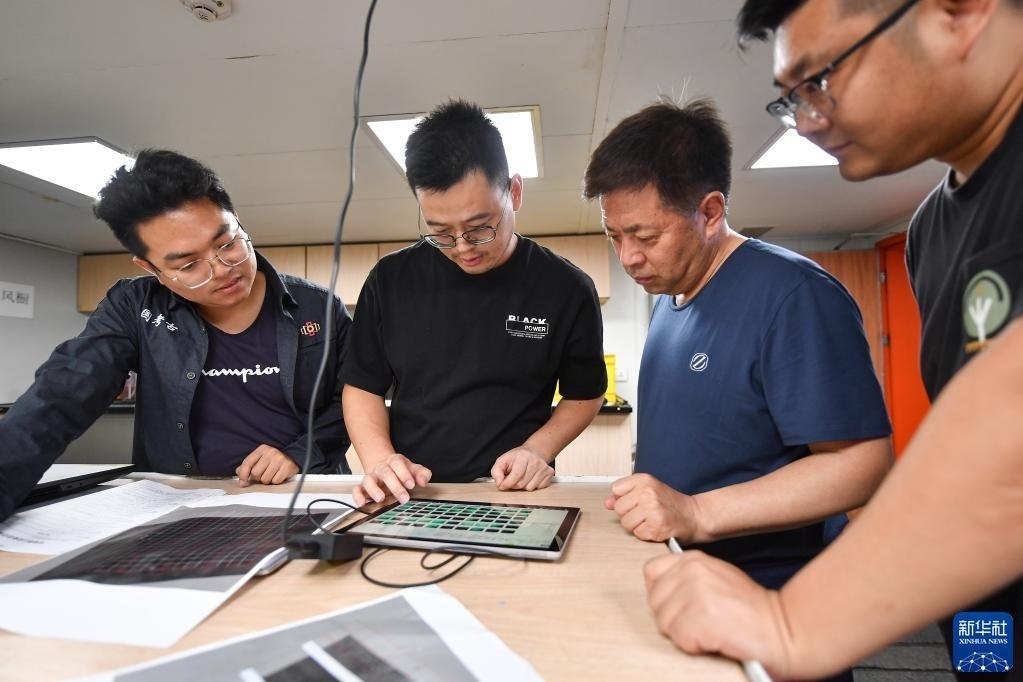 潛航員在“探索一號”科考船上整理從水下采集的考古數(shù)據(jù)(5月25日攝)。