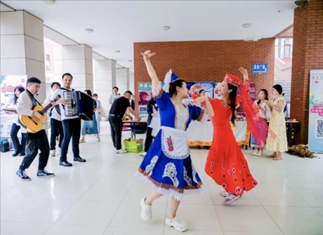 5月31日,“石榴籽 祖國(guó)行”新疆大學(xué)代表團(tuán)來到南開大學(xué)。在故事分享會(huì)上,王彥臣、李姝洋、迪力亞爾·迪力夏提同學(xué)向南開大學(xué)青年學(xué)子講述了“斷臂男孩”阿卜杜外力·阿卜杜拉、“黨徽大叔”阿布都加帕爾·猛德和“時(shí)代楷?!崩R尼·巴依卡的故事。在文藝大舞臺(tái)上,新疆大學(xué)代表團(tuán)各民族同學(xué)通過展示新疆特色舞蹈“木卡姆”、民族器樂“庫(kù)布孜”,向南開大學(xué)師生展現(xiàn)大美新疆熱情好客、能歌善舞的地域特色。