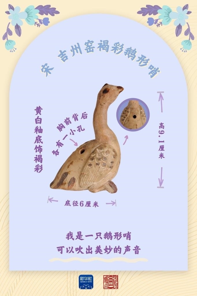 鵝形哨出土于江西吉安的宋代吉州窯遺址。吉安市博物館館長李希朗說,吉州窯的瓷土粗松,有近似于陶的特點(diǎn),可塑性較強(qiáng)。這里出土的瓷塑大多不超過10厘米,動(dòng)物瓷塑的原型多為社會(huì)生活中所常見。從出土的瓷塑數(shù)量來看,吉州窯當(dāng)年的訂單量很大,頗受市場歡迎。也許每一只鵝形哨的背后,都有一名鼓著腮幫子的稚童。歷經(jīng)時(shí)光荏苒,鵝形哨到今天還能發(fā)出動(dòng)聽的哨音。