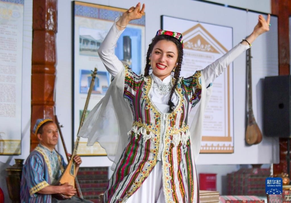 演員在新疆伊寧市喀贊其景區(qū)為游客表演“埃希來、葉來(一種烏茲別克族的民間傳統(tǒng)樂舞)”(5月18日攝)。新華社記者 王菲 攝