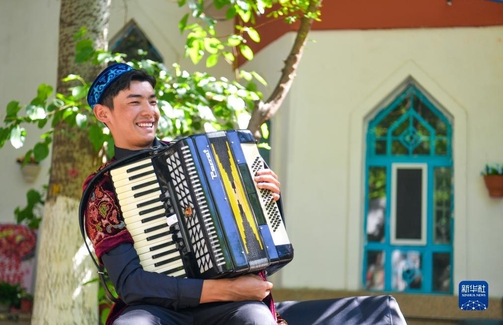 一名樂手在新疆伊寧市六星街街頭準(zhǔn)備演奏手風(fēng)琴(5月17日攝)。新華社記者 王菲 攝