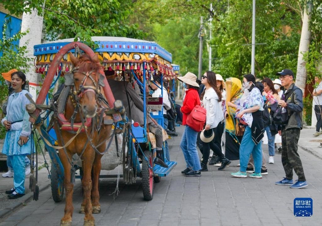 游客在新疆伊寧市喀贊其景區(qū)準(zhǔn)備乘坐馬車觀光(5月18日攝)。新華社記者 王菲 攝