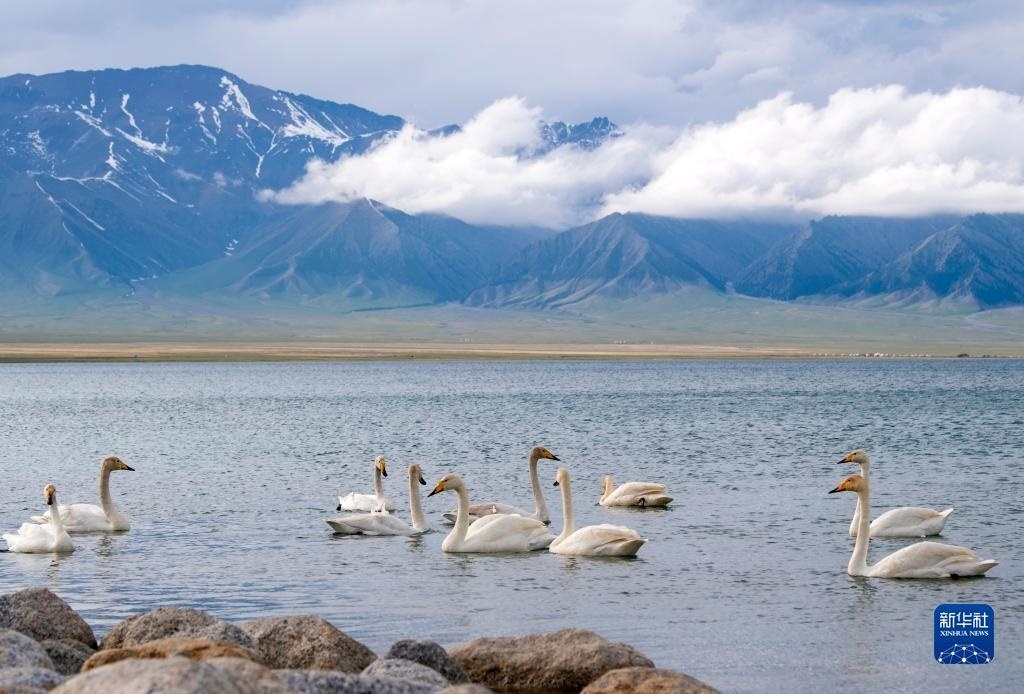 在新疆賽里木湖拍攝的天鵝(5月21日攝)。新華社記者 王菲 攝