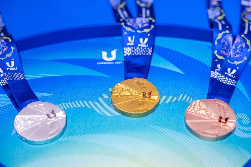 獎(jiǎng)牌是每個(gè)體育賽事的重要組成部分之一,本屆大運(yùn)會(huì)獎(jiǎng)牌根據(jù)國(guó)際大體聯(lián)要求,融合成都和國(guó)際化傳播元素,最終形成了大運(yùn)會(huì)獎(jiǎng)牌“蓉光”。獎(jiǎng)牌整體設(shè)計(jì)以成都大運(yùn)會(huì)會(huì)徽和太陽(yáng)神鳥(niǎo)為主要靈感,利用幾何扇面代表太陽(yáng)光芒,傳遞了太陽(yáng)神鳥(niǎo)守護(hù)夢(mèng)想的設(shè)計(jì)概念。獎(jiǎng)牌以“蓉光”為名,諧音為“榮光”,寓意榮耀、光彩,寄托了對(duì)大運(yùn)健兒在成都青春展翅、乘夢(mèng)而行的美好期許。