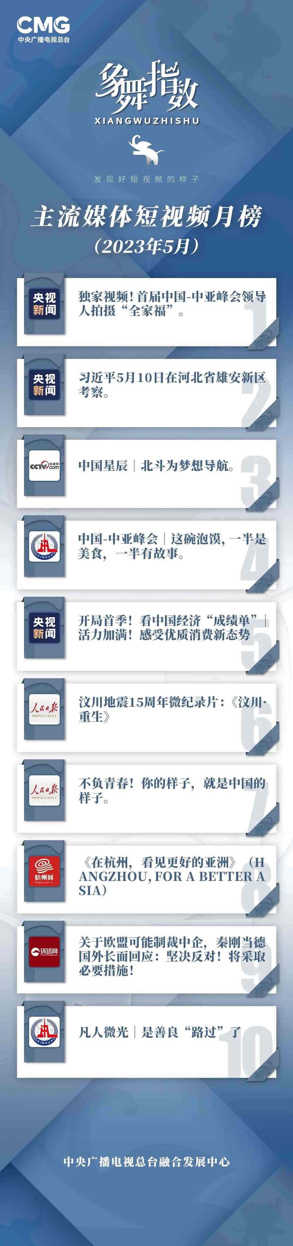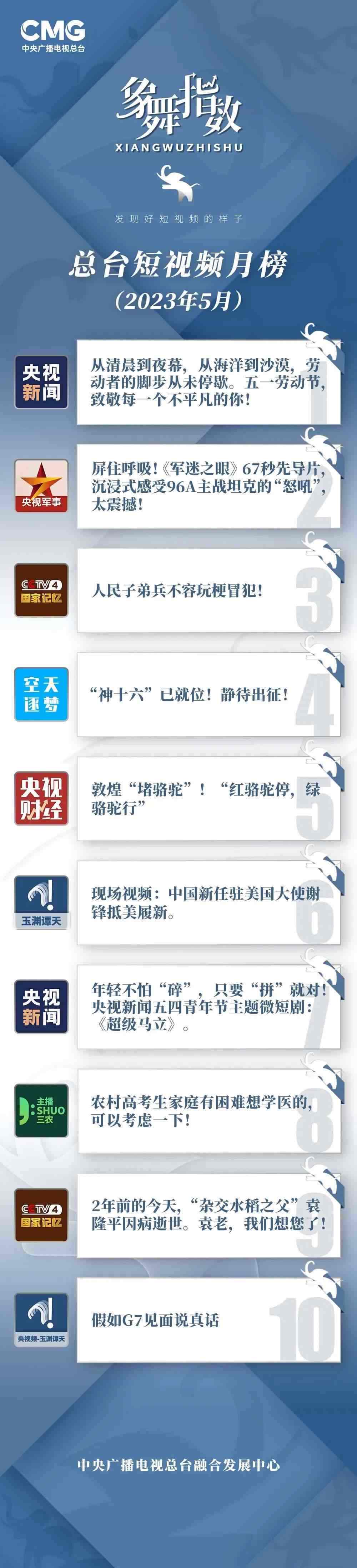 中央廣播電視總臺(tái)“象舞指數(shù)”評(píng)議品牌,推出主流媒體短視頻月榜、總臺(tái)短視頻月榜。在2023年5月,這些內(nèi)容引發(fā)大眾關(guān)注: