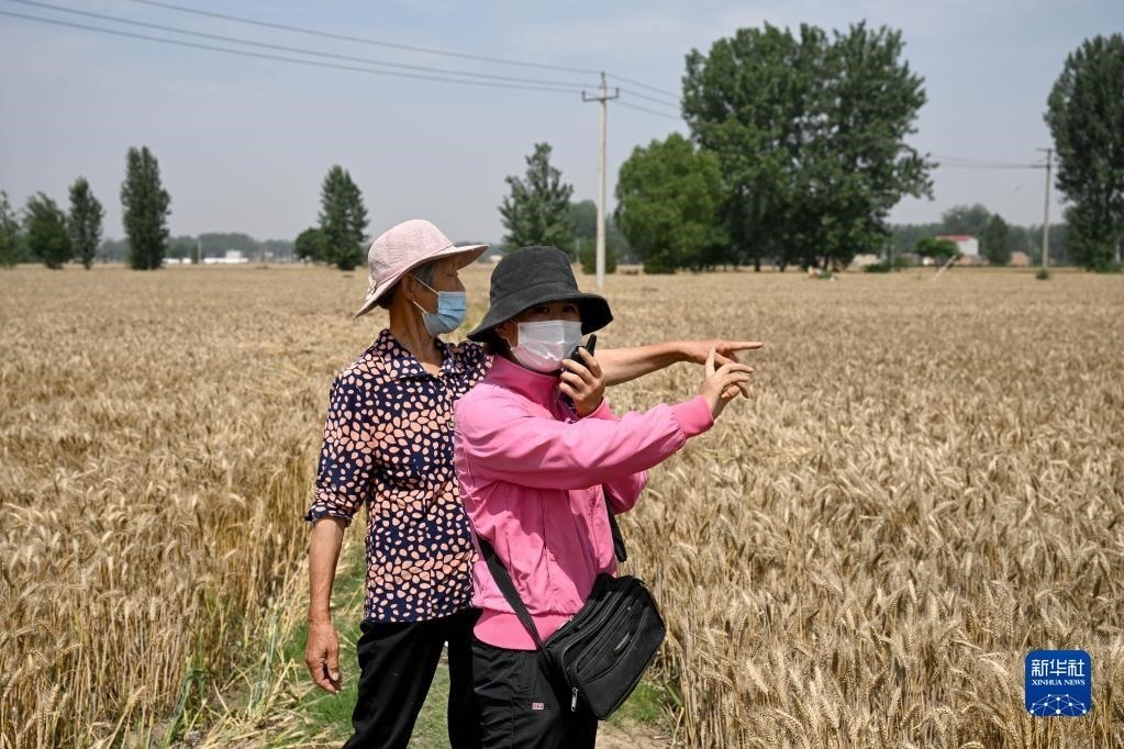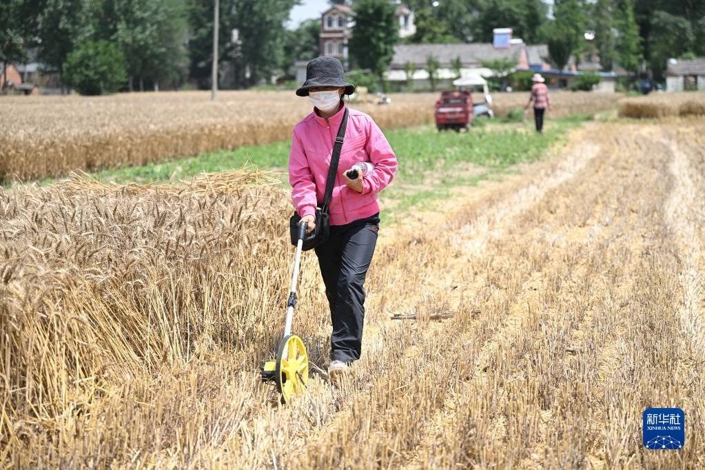 6月2日,在安徽省阜陽(yáng)市阜南縣許堂鄉(xiāng)劉崗村,陳麗娟使用農(nóng)田測(cè)畝儀測(cè)量麥田的面積。