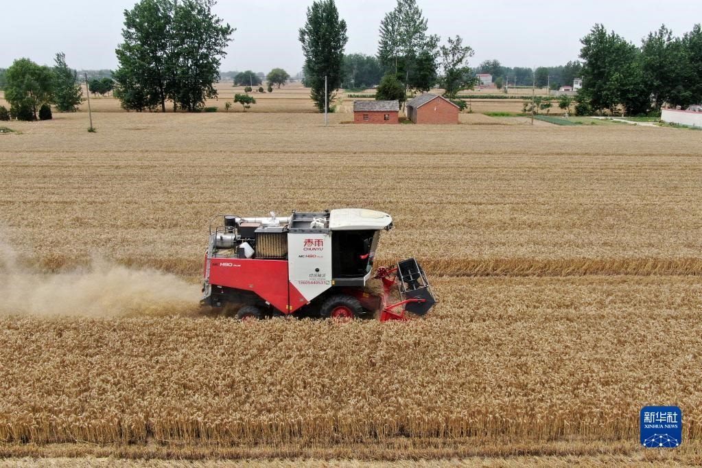 6月2日,在安徽省阜陽(yáng)市阜南縣許堂鄉(xiāng)劉崗村,董斐斐駕駛收割機(jī)為村民收割小麥。