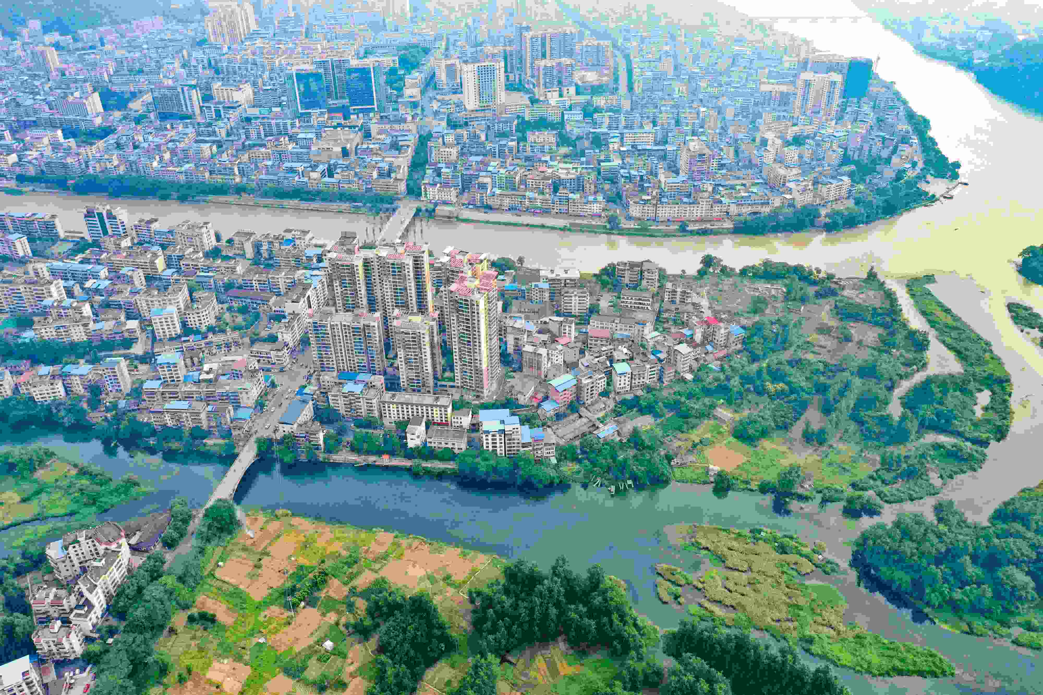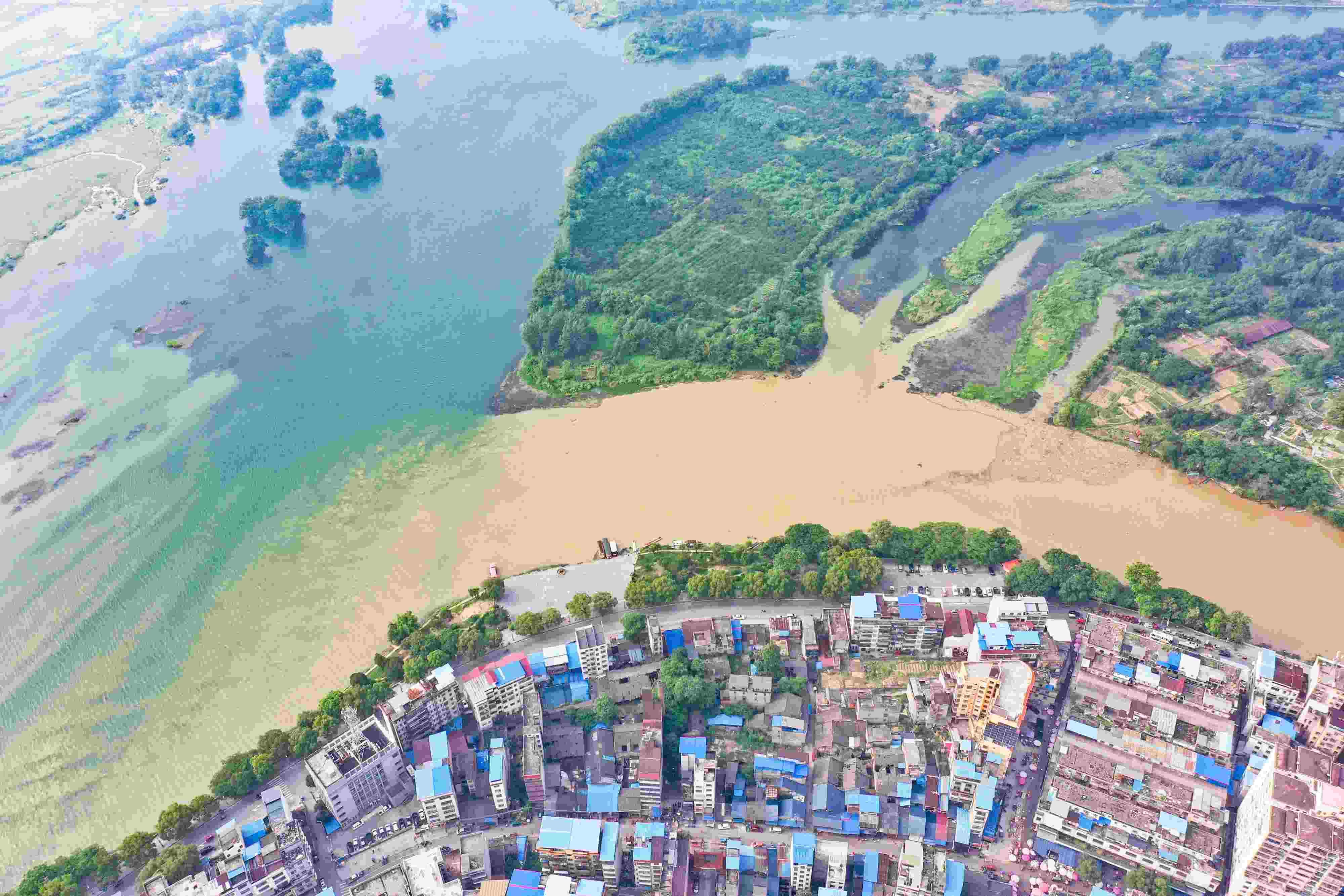 2023年6月4日,受降雨影響,廣西桂林全州縣城湘江河段出現(xiàn)涇渭分明景觀。空中俯瞰,湘江支流萬鄉(xiāng)河混濁的河水繞城匯入清澈的湘江干流,交匯之處涇渭分明。 視覺中國(guó)