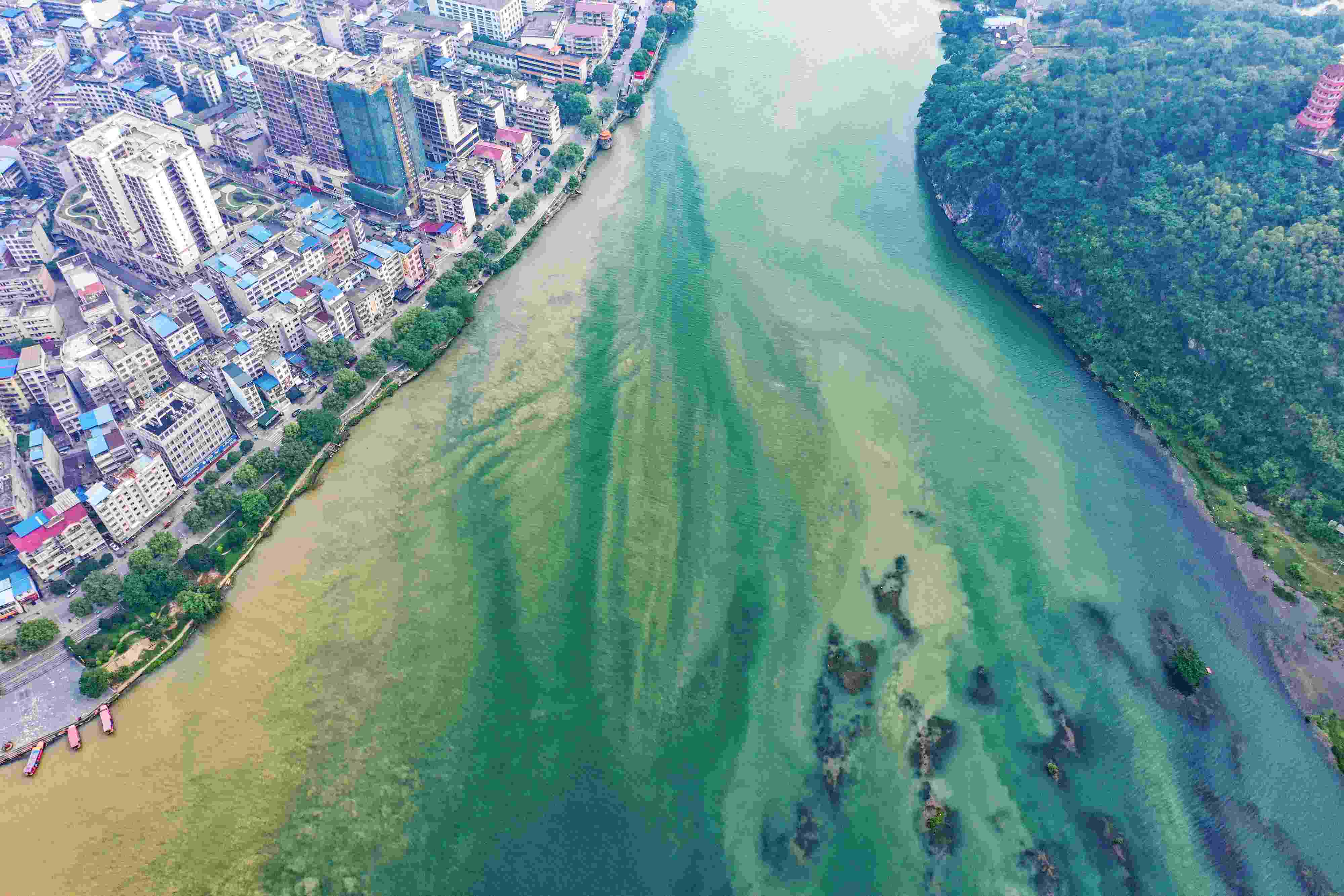 廣西桂林:雨后湘江涇渭分明
