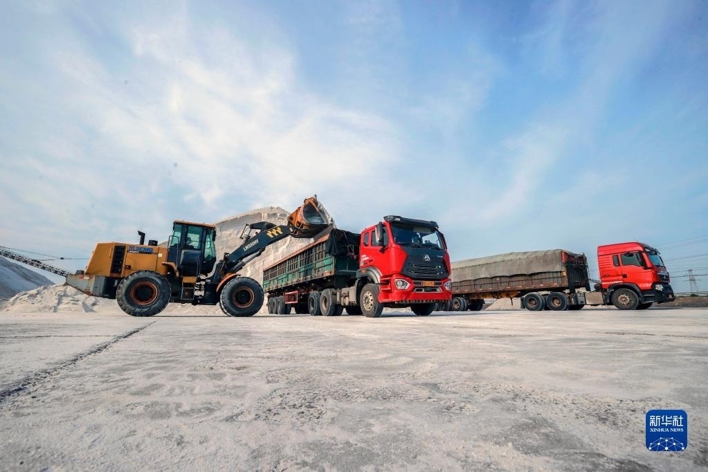 6月4日,工人操作設(shè)備在唐山海港經(jīng)濟(jì)開發(fā)區(qū)長蘆大清河鹽場將海鹽裝車,準(zhǔn)備外運(yùn)。