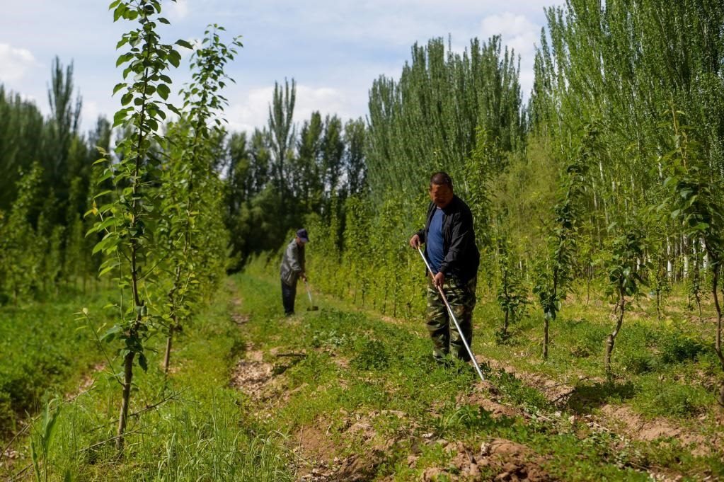6月5日,臨河區(qū)國營新華林場工人在管護(hù)林木。新華社記者 李志鵬 攝