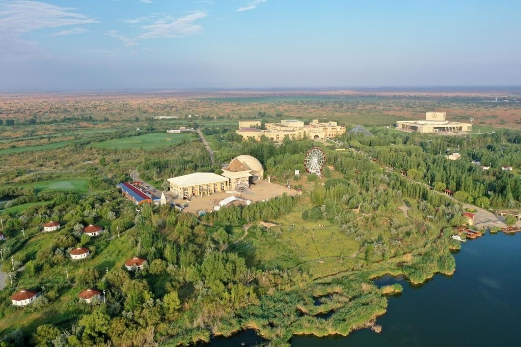 這是內蒙古鄂爾多斯市庫布其沙漠腹地的七星湖景區(qū)(2021年7月17日攝,無人機照片)。新華社記者 金良快 攝