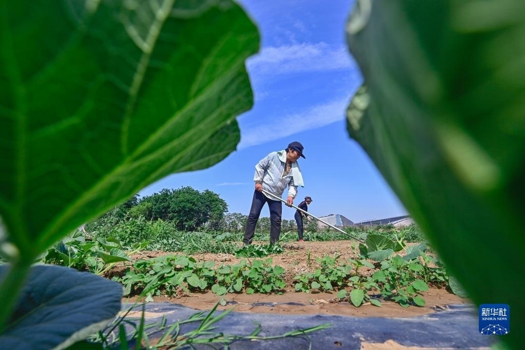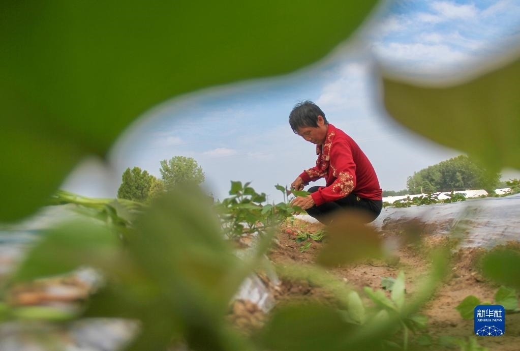 6月5日,農民在山東省青州市高柳鎮(zhèn)南馬蘭村一處葫蘆種植基地勞作。