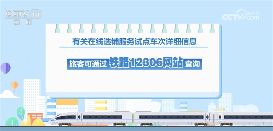 央視網(wǎng)消息:記者從國鐵集團(tuán)獲悉,今天(6月10日)起,鐵路部門將在12306網(wǎng)站和12306手機(jī)客戶端試行在線選鋪服務(wù)。